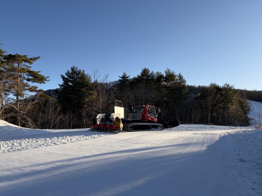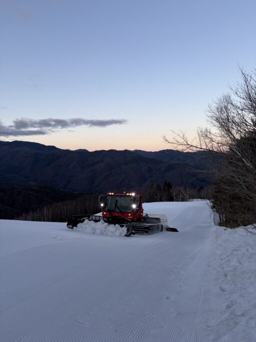 通常は朝に圧雪したいところですが、暖かくすぐにザクザクになってしまうため、まだ2月ですが夜圧雪での作業となりました。