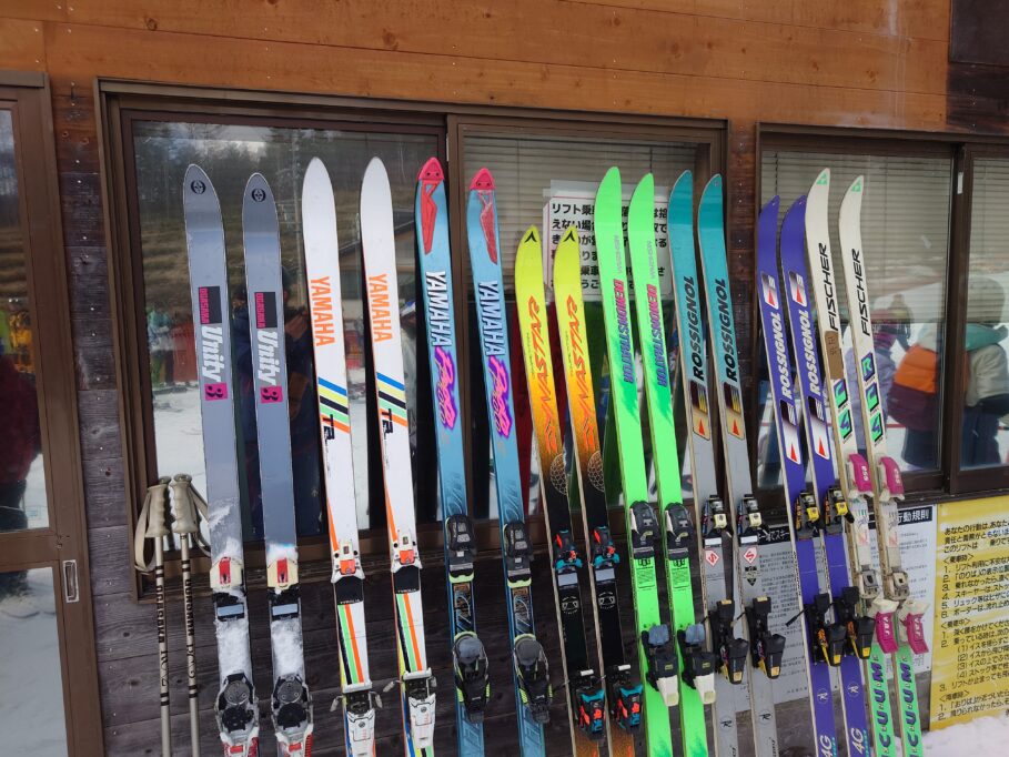 パトロール本部前に懐かしいスキーを展示しております。