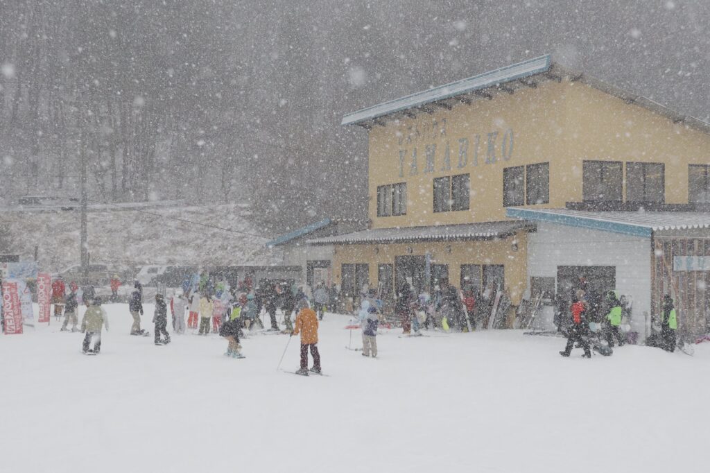 雪降りの中、ファミリーゲレンデを中心にとても賑わっています。