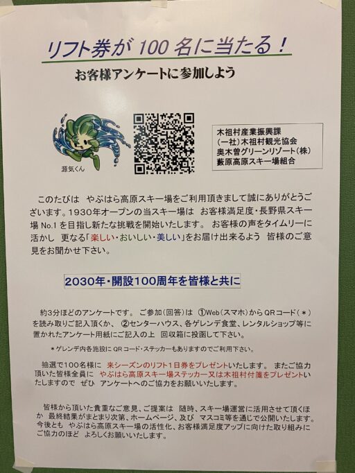 本日よりスキー場でお客様アンケートを実施しております。やぶはら高原スキー場が皆様に愛され、存続していけるようお客様の貴重なご意見をいただければ幸いです。QRコードまたはアンケート用紙からご回答いただけます。よろしくお願いいたします。